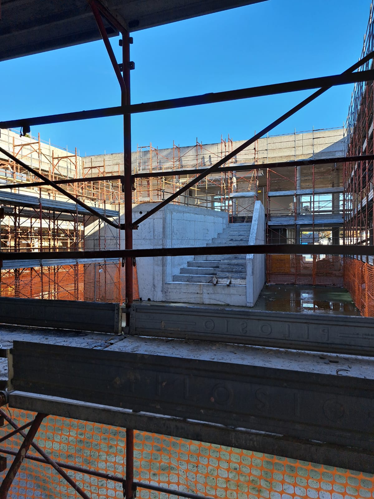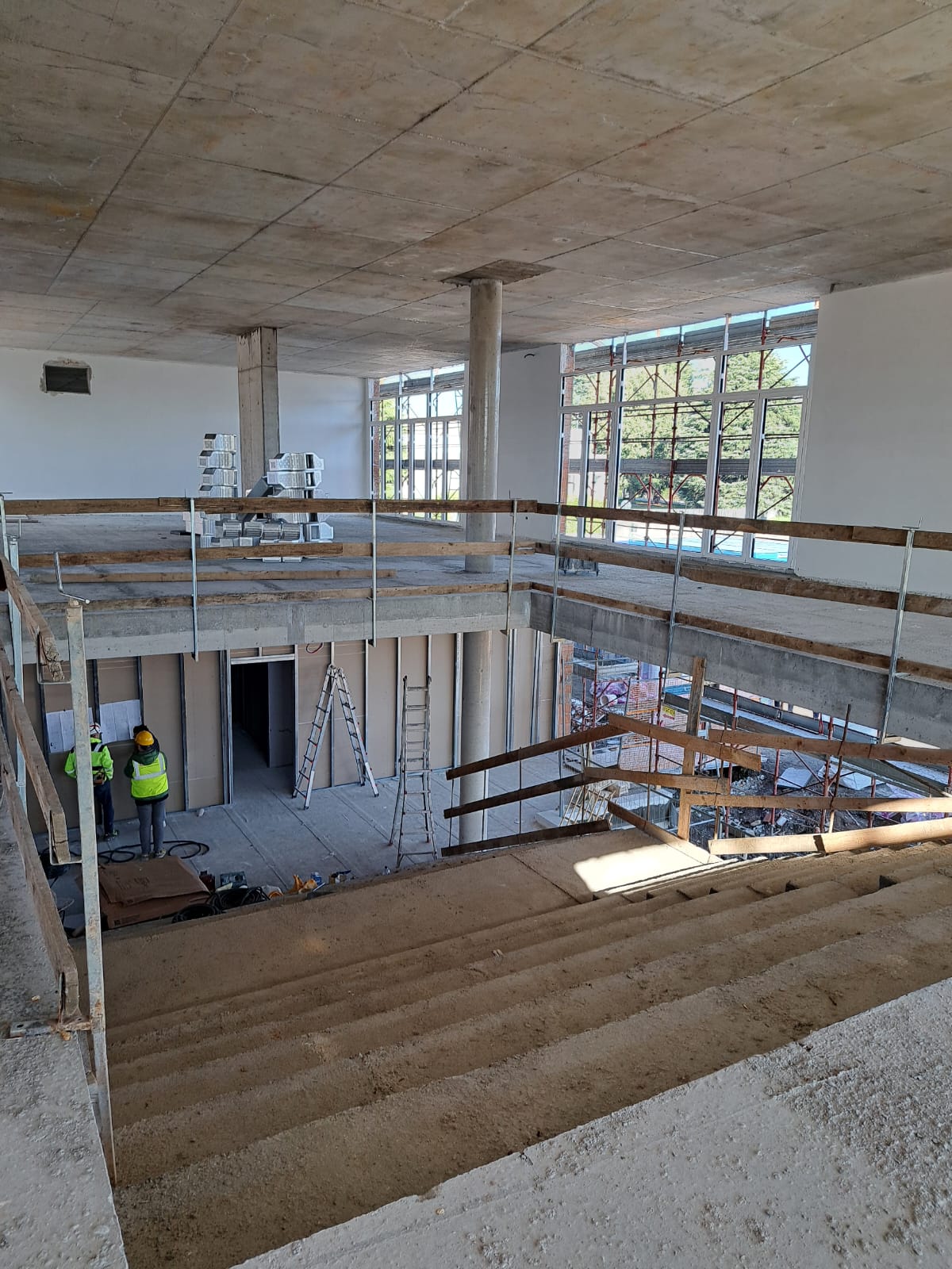 Durante la visita al cantiere si sono ben individuate le 15 classi moderne, luminose e funzionali, progettate per garantire il massimo comfort e accessibilità; l’aula cinema e l’aula arte, spazi dedicati alla creatività e all’espressione culturale; la grande scalinata dell’ingresso e qualla interna che permette l’accesso al giardino, pensate per favorire momenti di socializzazione e attività all’aria aperta; la palestra con gli spogliatoi e il sistema domtico di prossima installazione, per una gestione intelligente dell’energia.