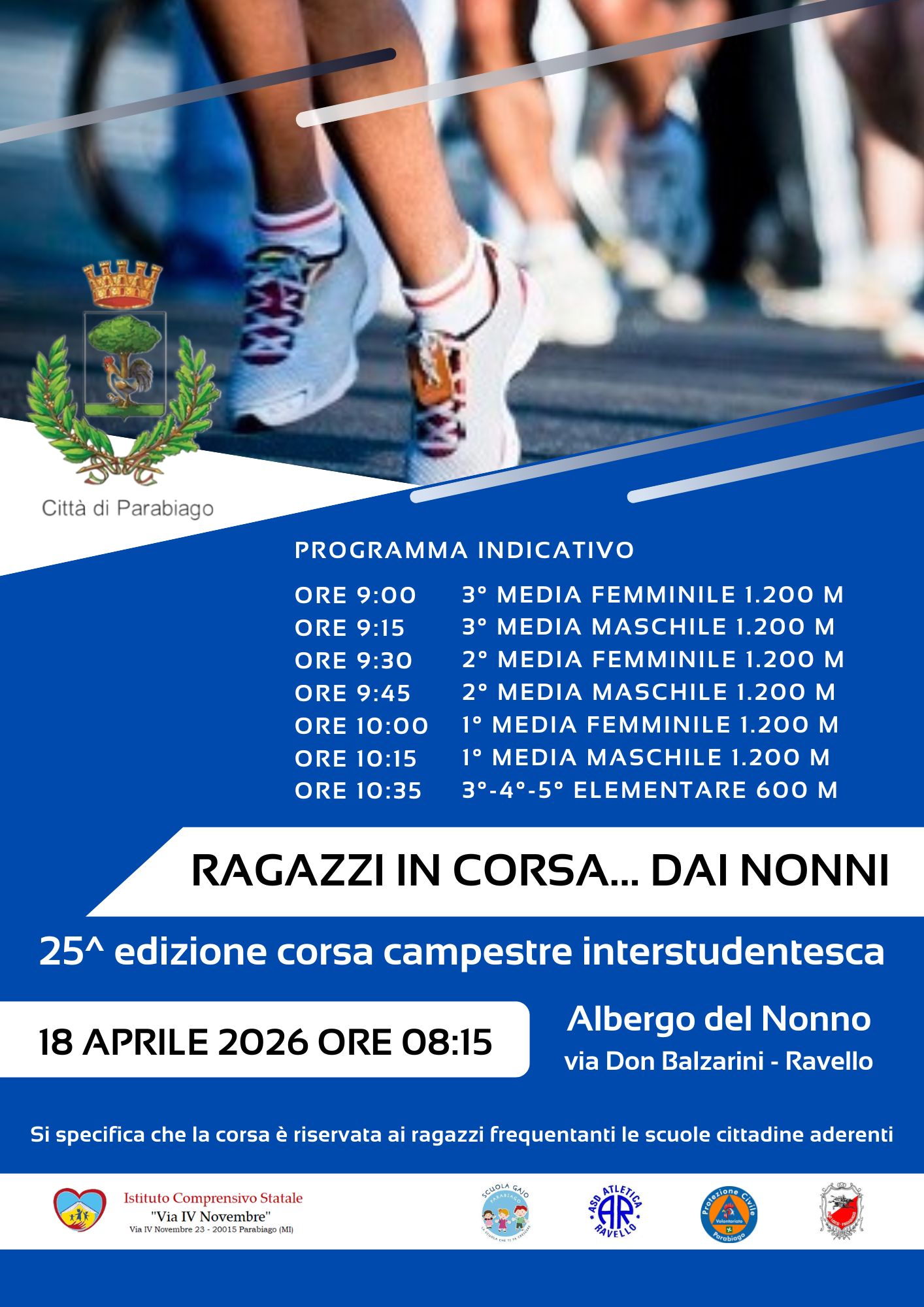 Sabato 18 aprile 2026 torna uno degli appuntamenti più attesi: Ragazzi in corsa... dai Nonni - la 25ª edizione della corsa campestre interstudentesca!